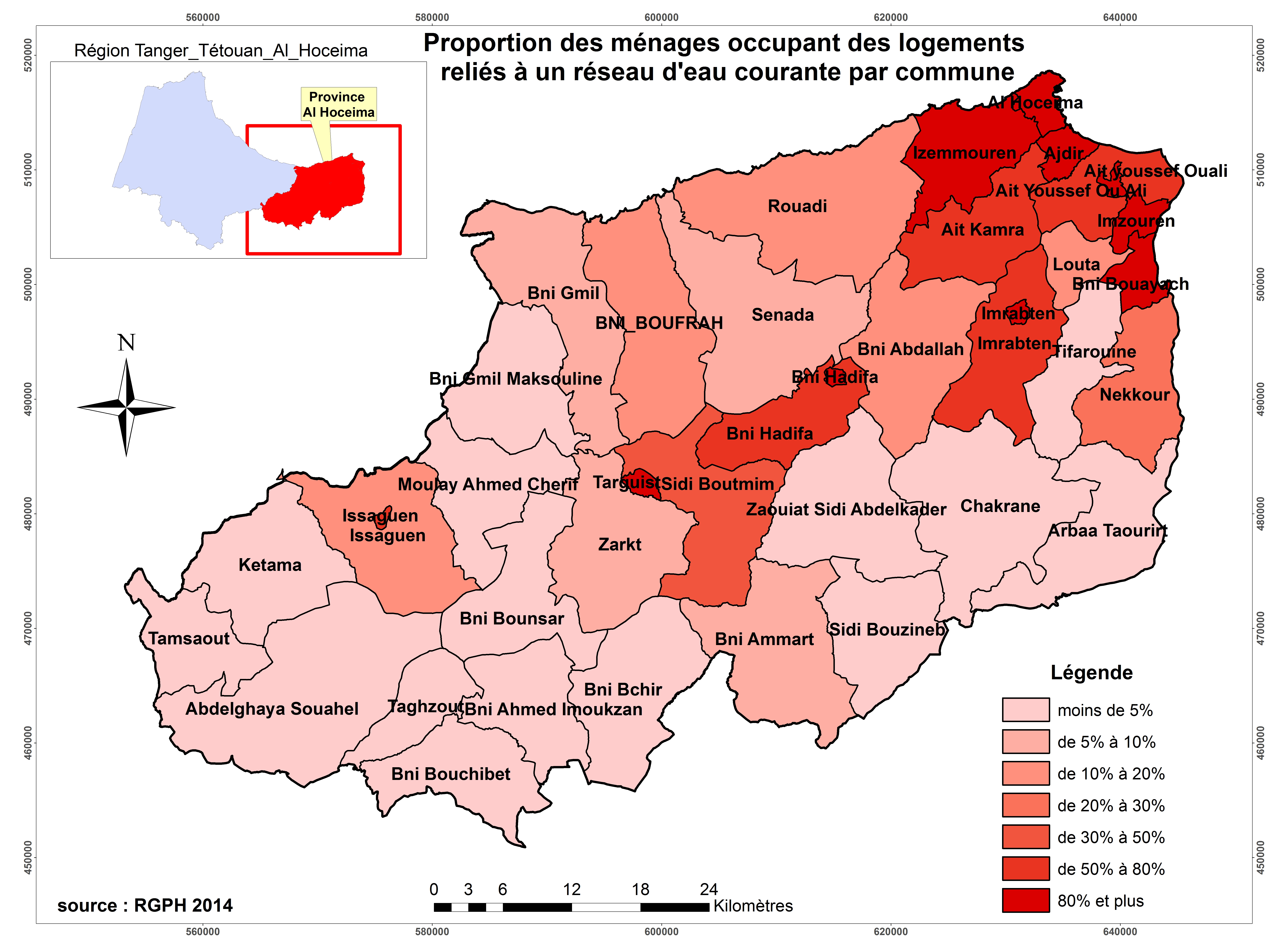Proportion des ménages occupant des logements reliés à un réseau d'eau courante par commune
